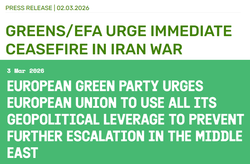 Euroopa Rohelised ja roheliste fraktsioon Euroopa Parlamendis on väljendanud oma juhtide tasandil sügavat mure USA ja Iisraeli sõjaliste rünnakute tagajärjel Lähis-Idas eskaleeruva vägivalla pärast, kutsunud kõiki osapooli üles lõpetama koheselt vaenutegevus, austama rahvusvahelist õigust ja lahendama oma erimeelsused diplomaatiliselt.